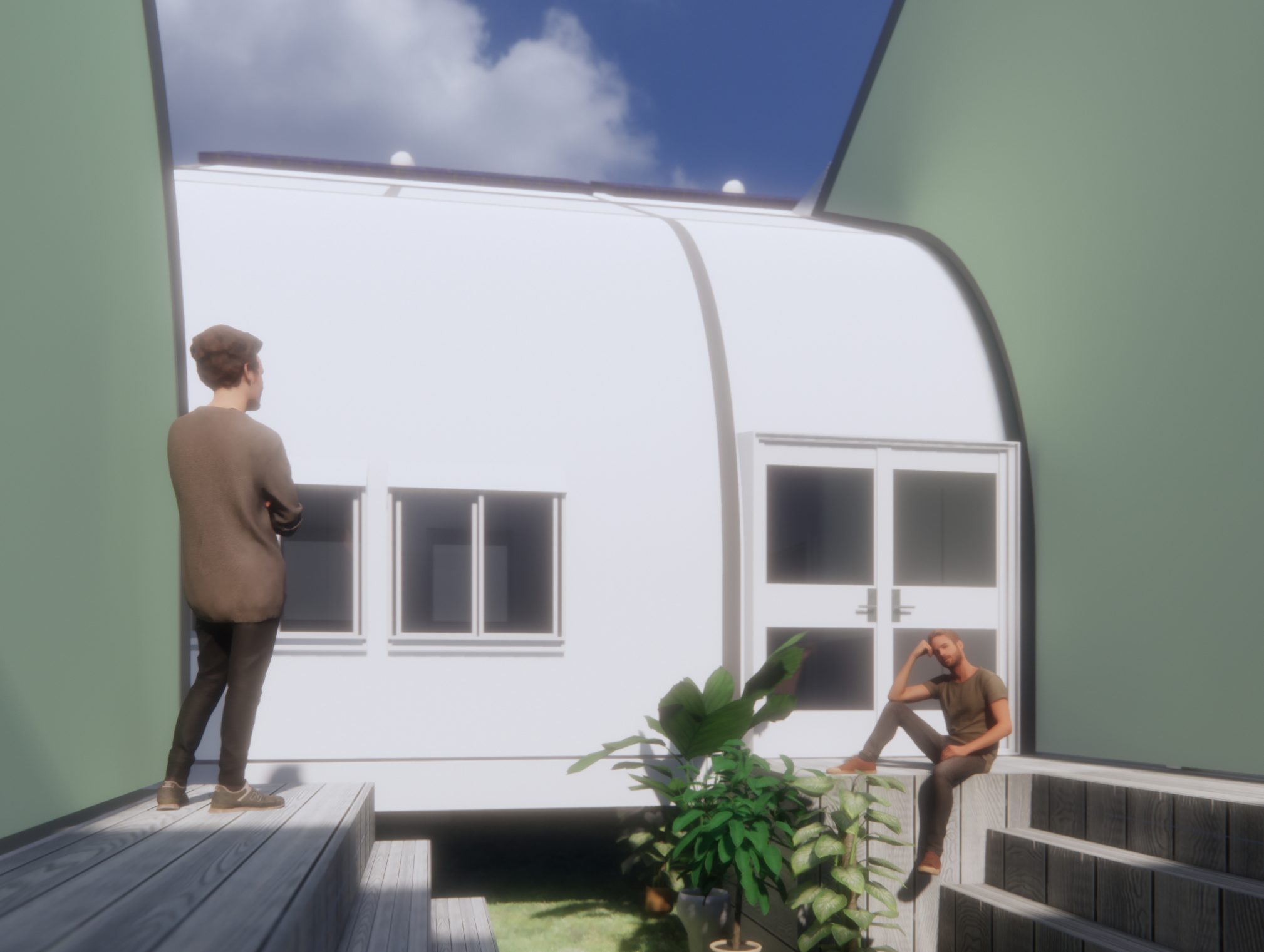 Residents’ stay begins in the largest lodgings (32-person capacity), located in the center of the site. Based on case managers’ assessments of their skills, interests, and progress, residents would be grouped into gradually smaller units, forming bonds and helping one another rediscover their purpose, study, train for jobs or certifications, and cooperating to maintain their shared space. Residences are arranged with the largest in the center, moving outward to smaller and more autonomous units at the perimeter – a transition that ultimately manifests in residents securing permanent housing and stable employment out in the world beyond.