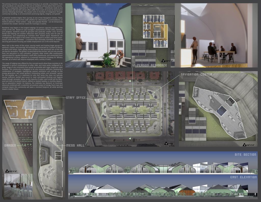 The primary function of any transitional housing is to provide a foundation from which residents can rebuild their life and re-establish a place within their community. This is especially important for homeless veterans – individuals ready to put service above self, but who all too often suffer from a lack of access to resources or services following discharge. This project aims to facilitate re-integration through community-building, in an environment promising dignity, integrity, and growth.
