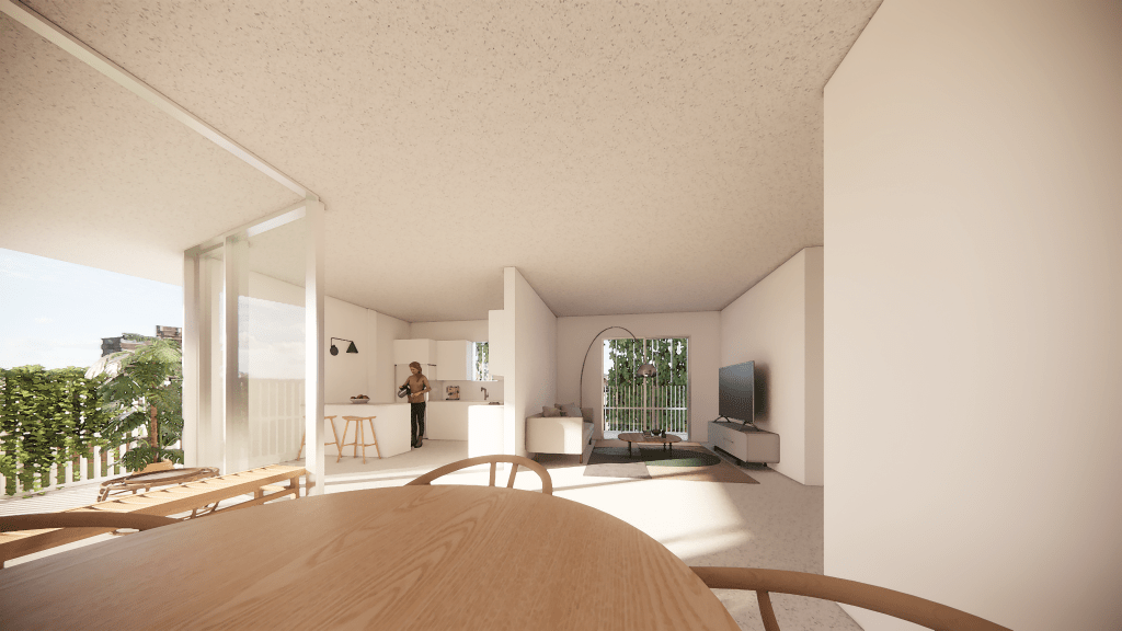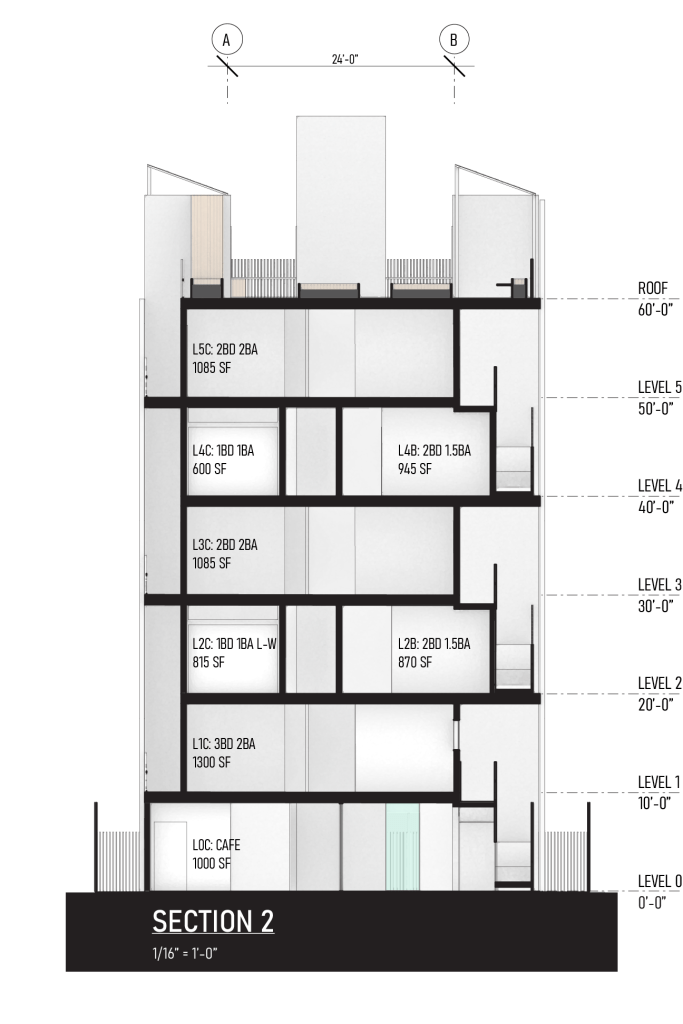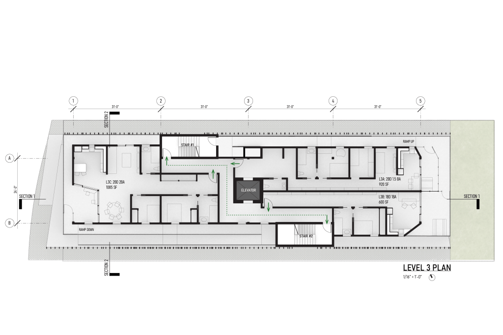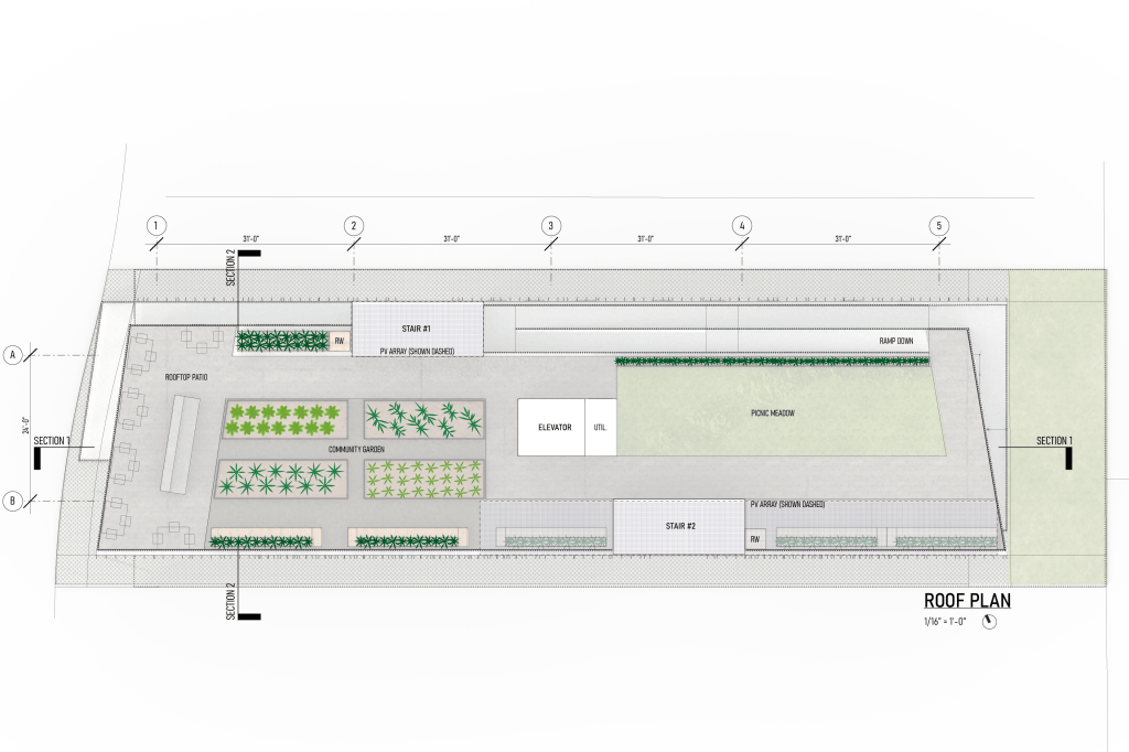 The North and South elevations feature extruded aluminum screens arranged in a musical rhythm and equipped with planters for fire-resistive vegetation. These vegetated screens provide shade and privacy, offering residents an experience similar to that of living in a verdant forest canopy. The units are laid out with accessibility in mind, accommodating a range of mobility needs. In addition to family-oriented units, the proposal includes two live-work units ideal for creative work. The functional interior spaces below the exterior ramps provide opportunities for creative space usage, from storage to kids’ play zones to reading nooks.